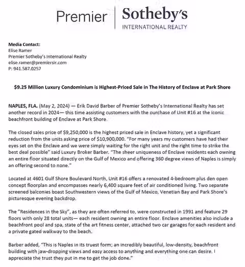 "I had an unbelievable experience working with Erik David Barber! He is an exceptional negotiator, incredibly organized, and his professional work ethic is truly remarkable. The home he sold for me required a realtor with extensive knowledge of the Naples market, and Erik proved to be the perfect choice. His expertise and dedication made the entire process seamless. I own other properties, and without a doubt, Erik will be my go-to real estate agent in the future. Highly recommend!"